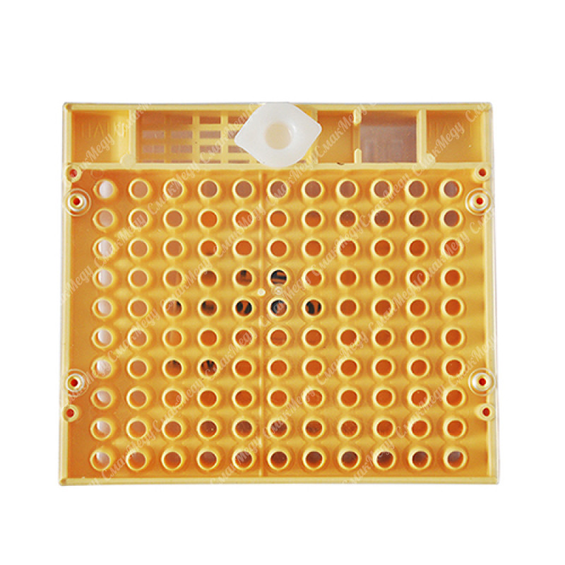 Система также для подсадки в семью новой матки. Для этого на задней стенке кассеты имеется маленькое пространство с переходом на лицевую сторону кассеты. Этот переход закрыть кормом и пустить туда матку. Матка имеет контакт с пчелами все то время, пока они не проедят корм. В этом случае можно быть уверенным, что пчелы не убьют новую матку. Кроме того матка находится под разделительной решеткой и откладывает яйца сразу в кассету. Особенно удобна эта система для проверки искусственно осемененных маток.
