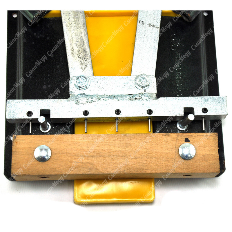 Дырокол помогает пчеловоду автоматизировать процесс прокалывания боковых планок рамки. Конструкция дырокола простая и надежная между иглой и брусом вставляется боковая планка рамки. При нажатии на ручки иглы прокалывают деревянную планку и на планке становиться 5 отверстий. Для удобства дырокол можно закрепить на рабочей поверхности но это не обязательно.