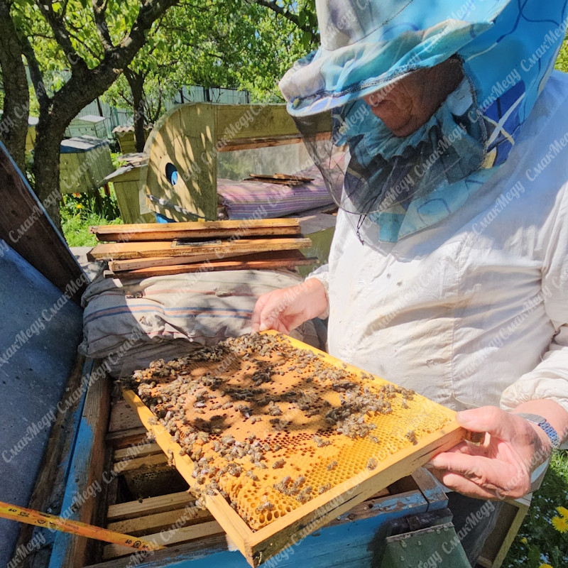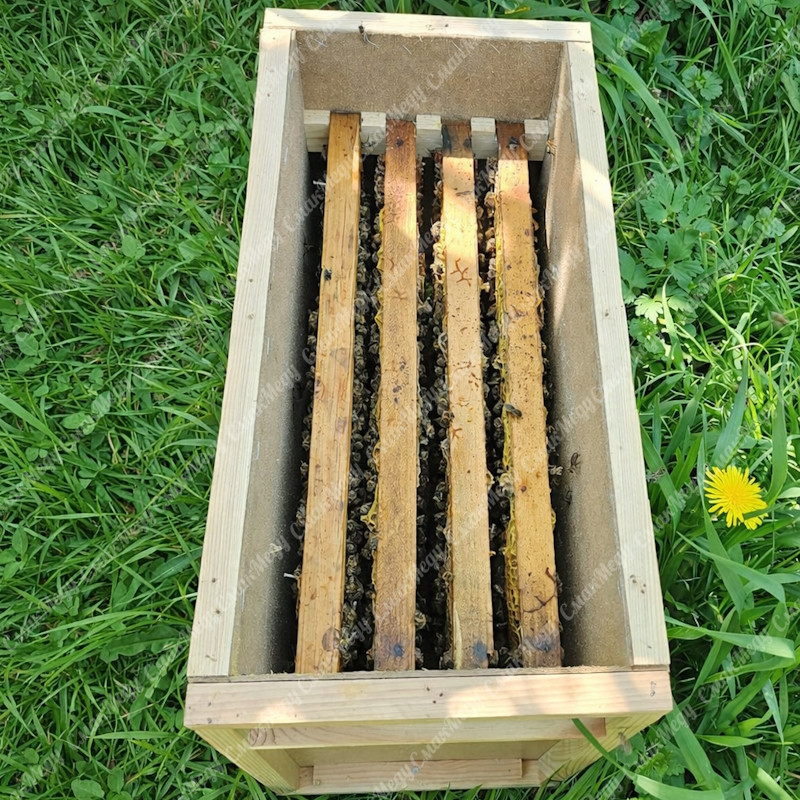 Пакет формується із чотирьох рамок печатного розплоду (відбираються кращі рамки з бджолородини). До складу пакету також входить молода плідна матка 2025 року. Усі рамки щільно обсижені молодою бджолою, кількість бджоли максимально допустима для успішної доставки бджолопакету та становить близько 1-1,3 кг.